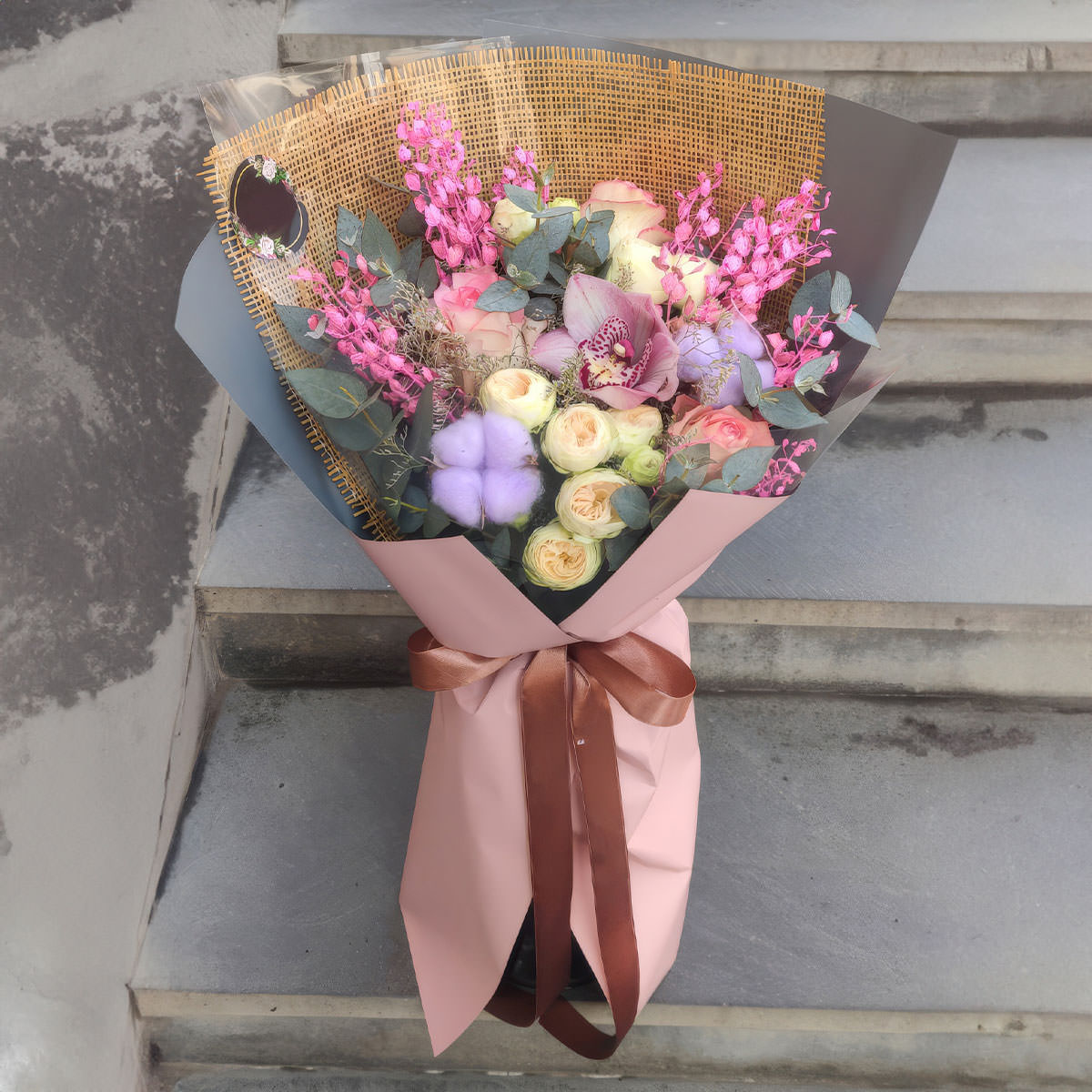 Орхидея розовая, роза кустовая пионовидная кремовая, роза одноголовая оранжевая, лунария розовая, хлопок, эвкалипт. Упаковка (лента, пленка, крафт, сетка, пленка матовая)