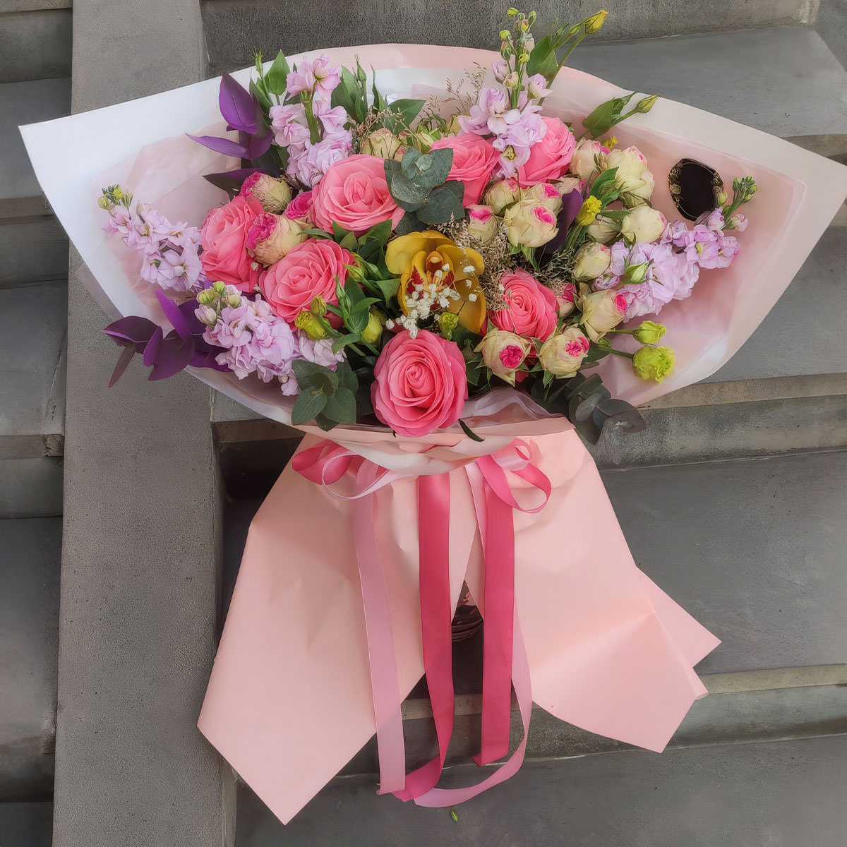 Роза одноголовая розовая, роза кустовая пионовидная розовая, орхидея желтая, маттиола розовая, эвкалипт, гипсофила. Упаковка (лента, пленка, крафт, сетка, пленка матовая)