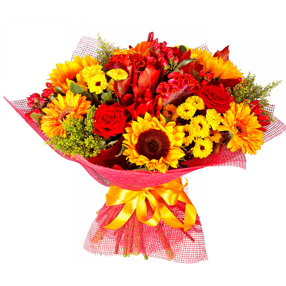 Подсолнух, гербера желтая, роза одноголовая красная, хризантема кустовая мини желтая, гипперикум, кленовый лист. Упаковка (лента, пленка, крафт, сетка, пленка матовая)