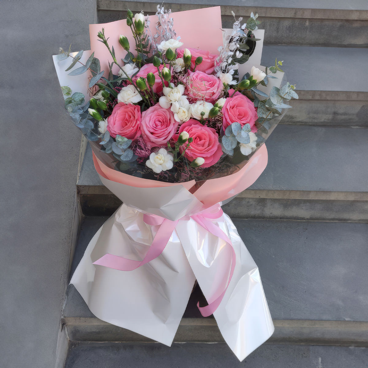 Роза одноголовая розовая, маттиола белая, эвкалипт. Упаковка (лента, пленка, крафт, сетка, пленка матовая)