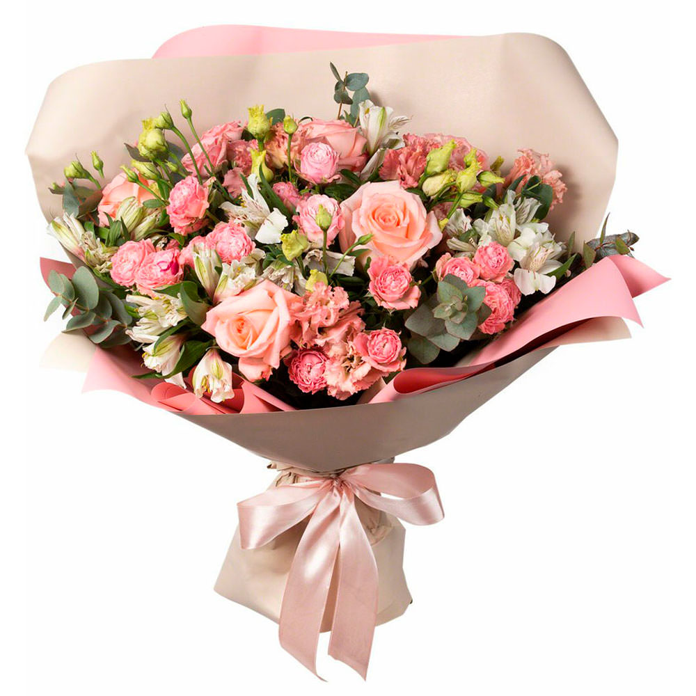 Роза одноголовая розовая, роза кустовая розовая, альстромерия белая, эвкалипат. Упаковка (лента, пленка, крафт, сетка, пленка матовая)