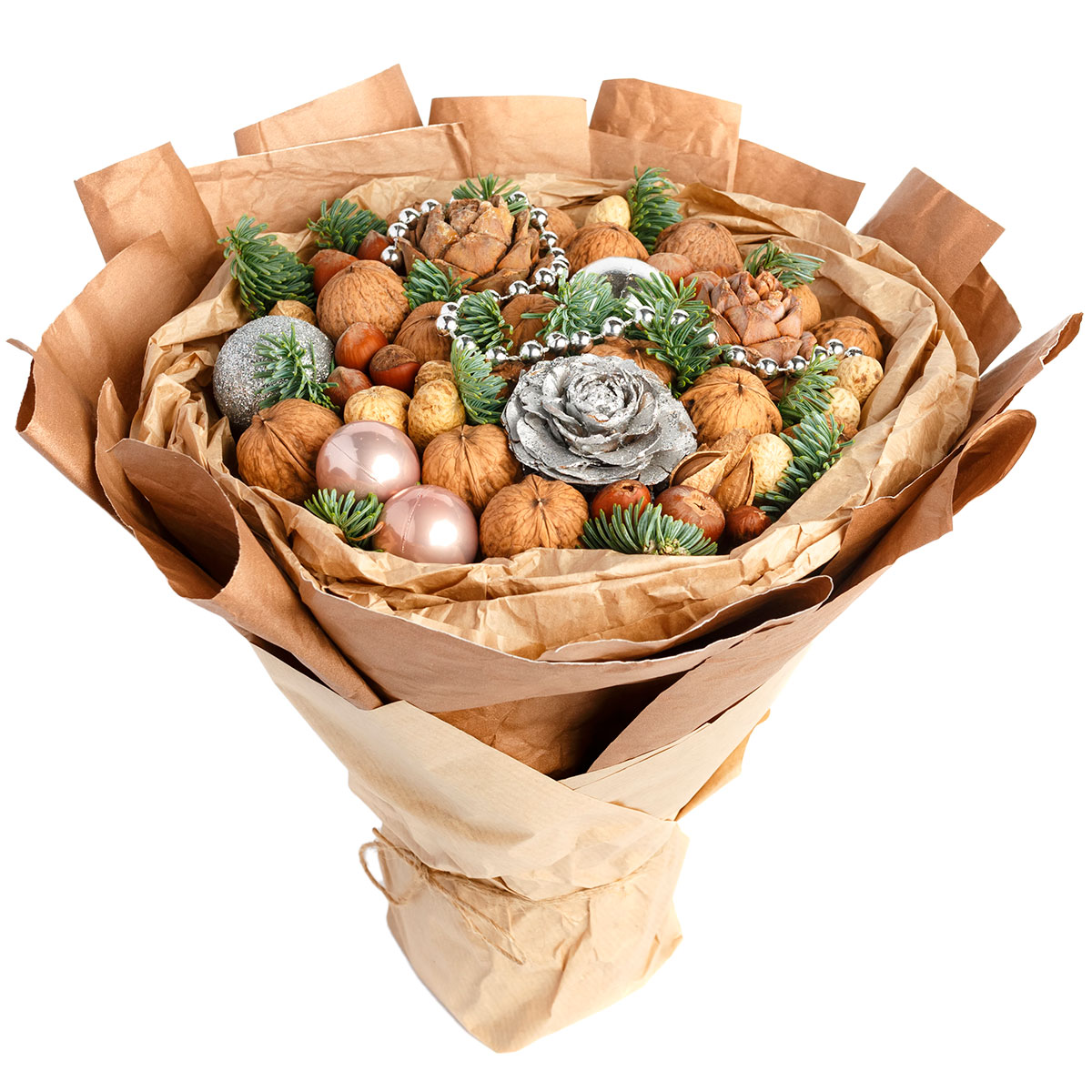 Орех грецкий, арахис, миндаль, фундук, пихта, шишки, декоративные шары. Упаковка (лента, пленка, крафт, сетка, пленка матовая)