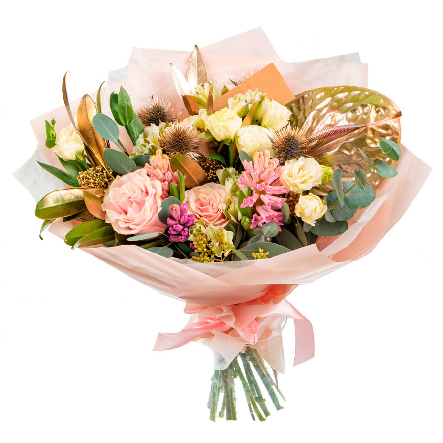 Антуриум, роза одноголовая розовая, гиацинт розовый, альстромерия, эустома кремовая, эрингиум, скимия, эвкалипт. Упаковка (лента, пленка, крафт, сетка, пленка матовая)