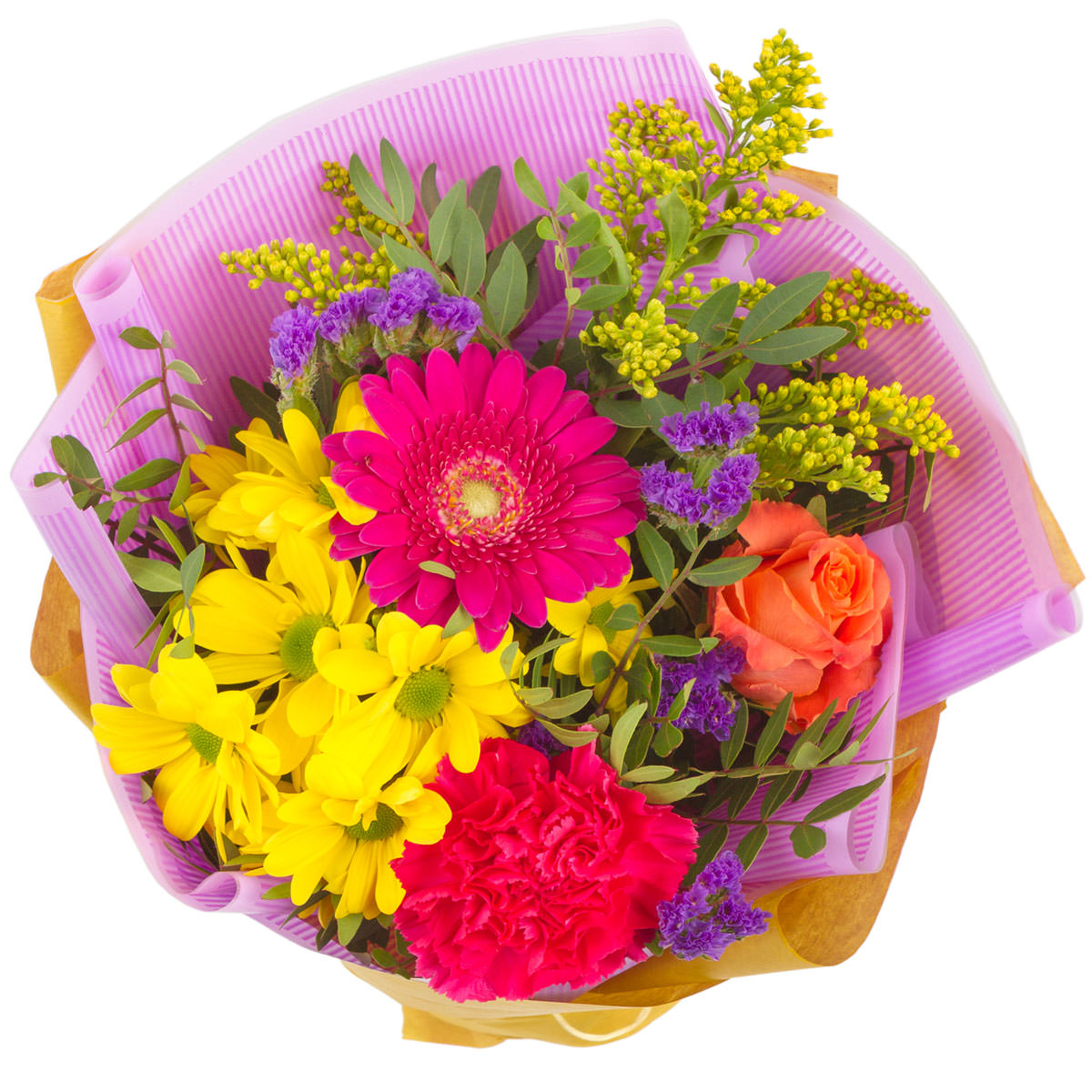 Хризантема кустовая желтая, гербера розовая, гвоздика розовая, роза одноголовая оранжевая, статица фиолетовая, солидаго, фисташка. Упаковка (лента, пленка, крафт, сетка, пленка матовая)