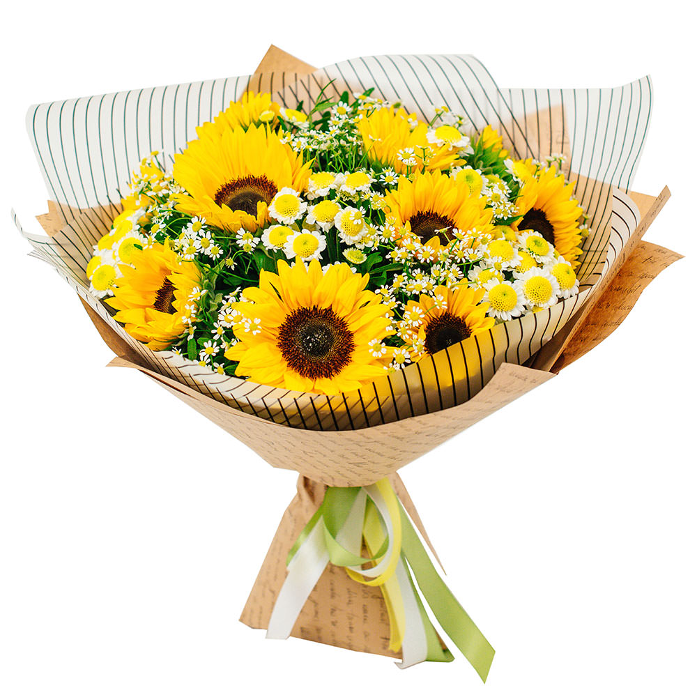 Подсолнух, ромашка двух видов. Упаковка (лента, пленка, крафт, сетка, пленка матовая)