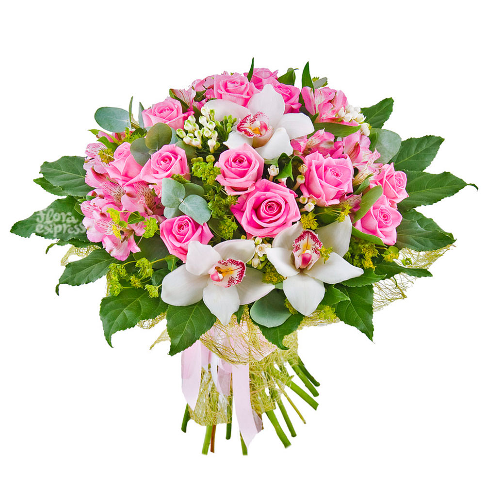 Роза одноголовая розовая, орхидея белая, альстромерия розовая, бруния, эвкалипт. Упаковка (лента, пленка, крафт, сетка, пленка матовая)
