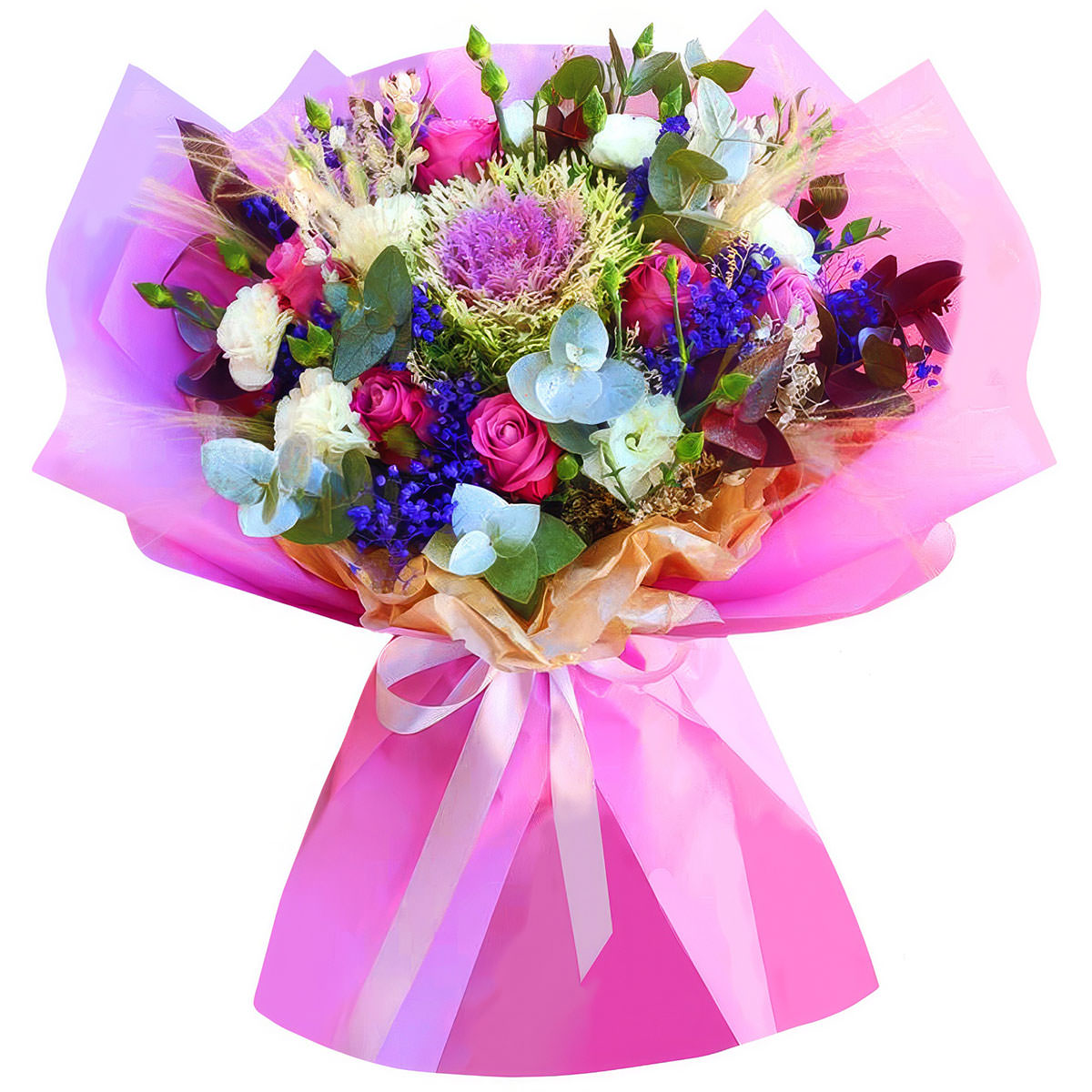 Брассика, роза кустовая розовая, эустома белая, гипсофила синяя, эвкалипт. Упаковка (лента, пленка, крафт, сетка, пленка матовая)