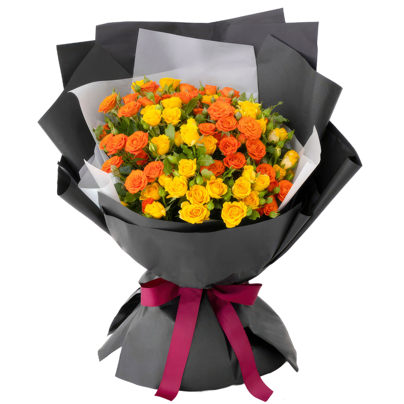 Роза кустовая желтая и оранжевая. Упаковка (лента, пленка, крафт, сетка, пленка матовая)