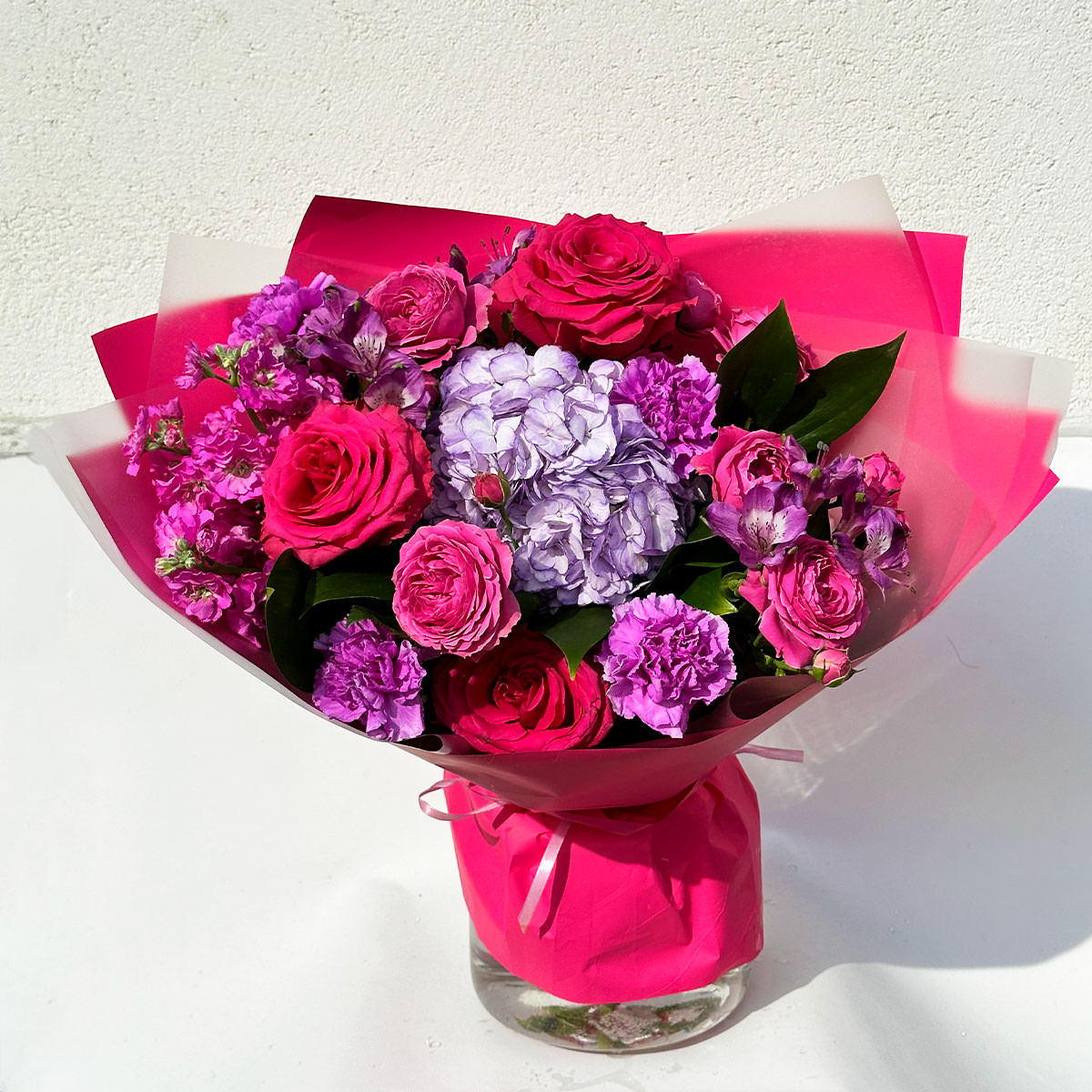 Гортензия фиолетовая, роза одноголовая розовая, гвоздика сиреневая, альстромерия, маттиола. Упаковка (лента, пленка, крафт, сетка, пленка матовая)
