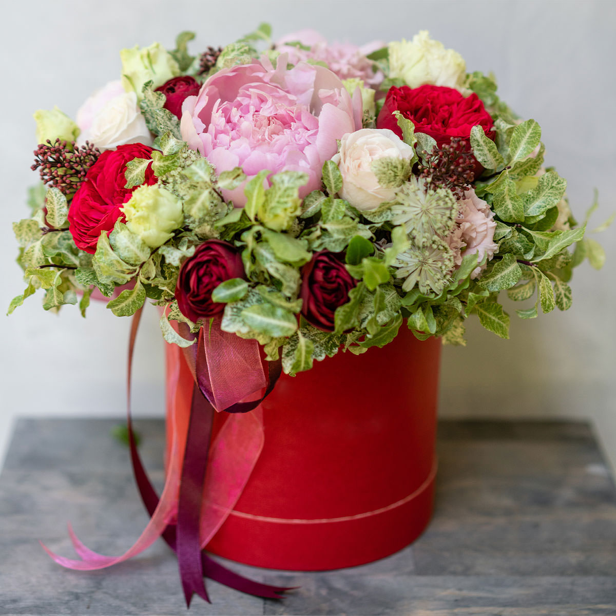 Пион розовый, роза пионовидная красная, роза кустовая белая, эустома светло-желтая, зелень. Упаковка (шляпная коробка, квадратный бокс, коробка сердце, оазис)