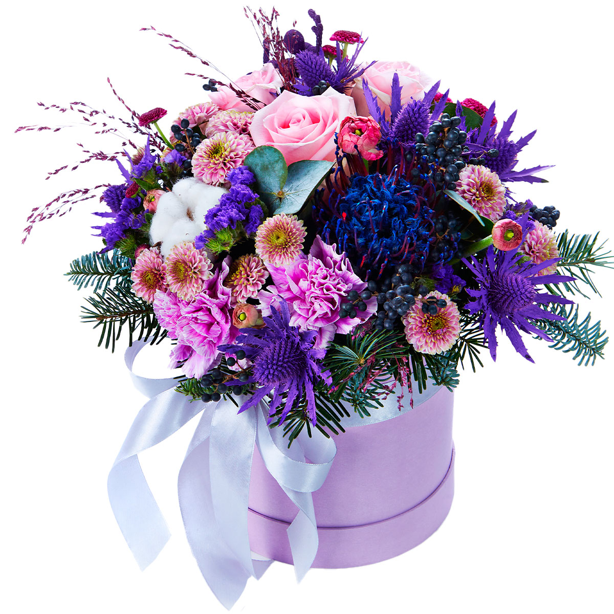 Роза одноголовая розовая, гвоздика сиреневая, эрингиум, гиацинт синий, хризантема кустовая розовая, хлопок, статица, хвоя. Упаковка (шляпная коробка, квадратный бокс, коробка сердце, оазис)