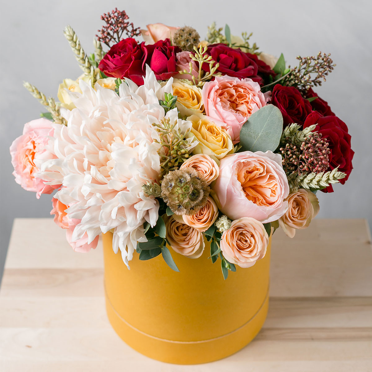Пион кремовый, роза пионовидная персиковая, роза одноголовая красная, роза кустовая жёлтая, скабиоза сухоцвет, колос. Упаковка (шляпная коробка, квадратный бокс, коробка сердце, оазис)