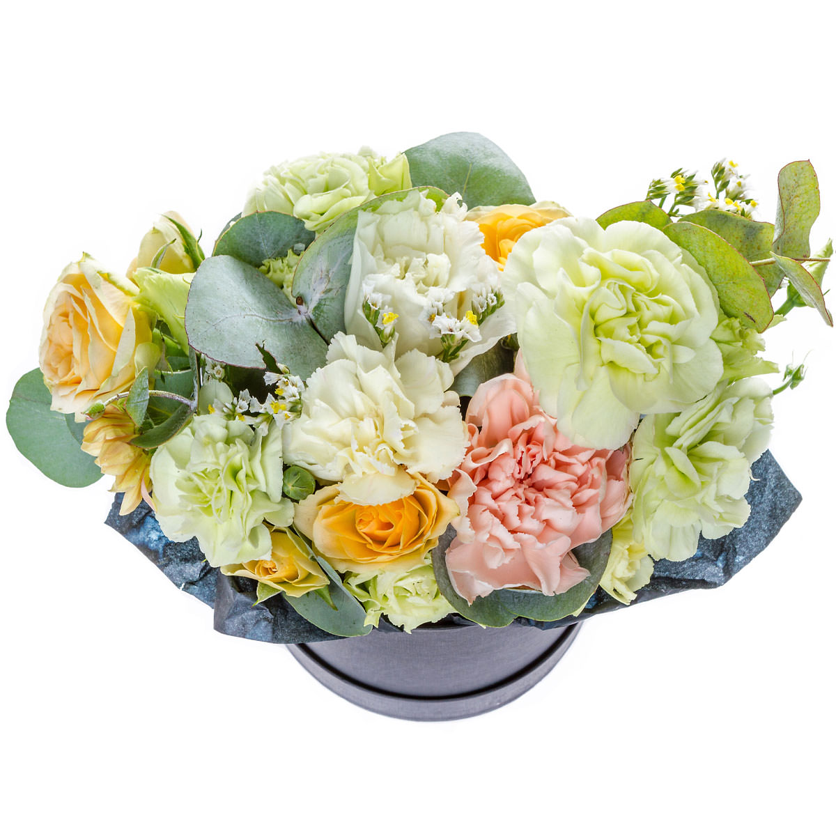 Роза кустовая желтая, пион розовый, гвоздика бело-зеленая, эустома белая, хризантема кустовая персиковая, статица белая, эвкалипт. Упаковка (шляпная коробка, квадратный бокс, коробка сердце, оазис)