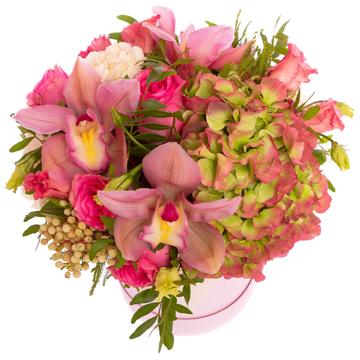 Орхидея розовая, гортензия розово-зеленая, роза одноголовая розовая, эустома розовая и белая, бруния, фисташка. Упаковка (шляпная коробка, квадратный бокс, коробка сердце, оазис)